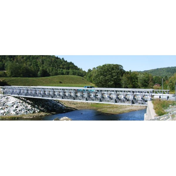A Bailey bridge had the advantages of requiring heavy equipment to assemble. The steel bridge elements are small and light enough to be carried by trucks and lifted into place by hand. They are strong enough to carry heavy trucks and tanks.
